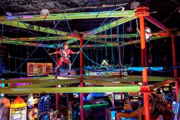 - Sky Trail Ropes Course With Curved Zip Line – The Sky Trail indoor high adventure ropes course is suspended above the arcade and is the first one in Florida to feature a unique curved zip line. Their are two levels of elements: Beginner and Advanced. Each experience is approximately 10 minutes in length.